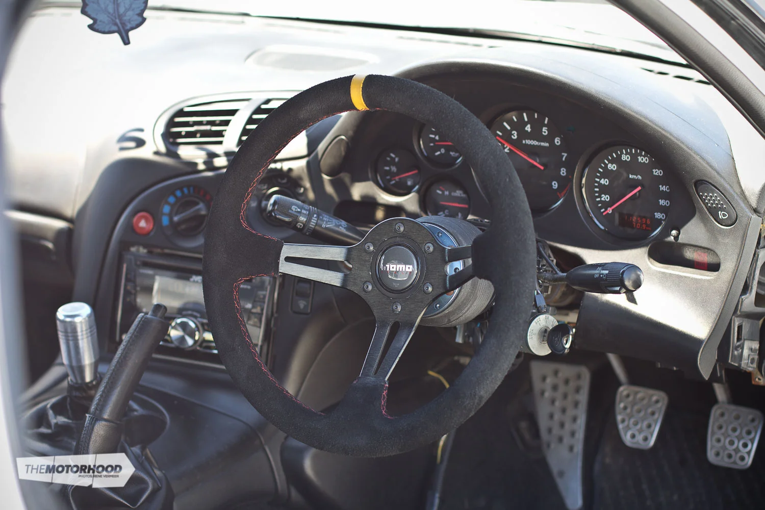 The more serious RX-7 of the two had to be the white example. What first caught my eye was the extremely dished Work Emotion D9R wheels in black, measuring 18×10.5 inches. The tyres seamlessly slide into the guards when cruising — not an easy achievement at this static height.