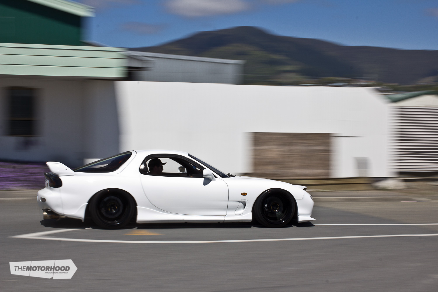 James purchased the RX-7 when it was in a very bad way. It had been outside soaking up vitamin D for the better part of 20 years, so upon arrival in Nelson it was sent off to the painters to have a complete respray in gloss white, and a complete S8 facelift, which includes the front bar, rear wing, tail lights, and Mazdaspeed side skirts. Although only a gloss white, not a metallic, it works really well with the contrasting D9Rs.