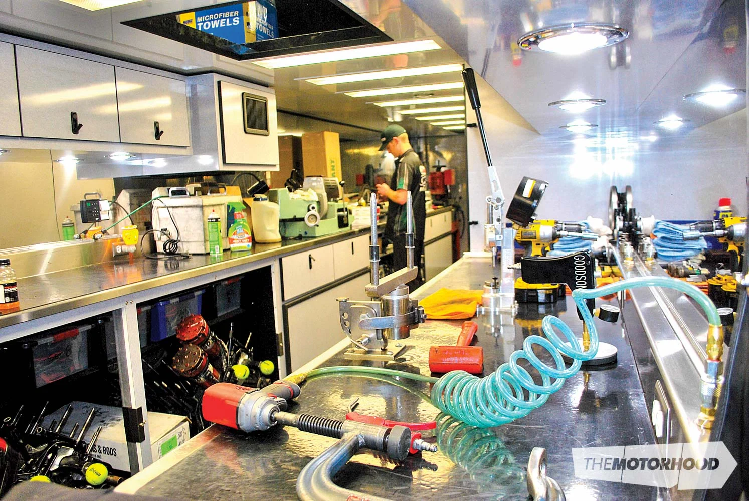 The set-up itself was more than impressive, with two trucks and trailers per team parked side by side and linked together, creating a truly mobile workshop. They have absolutely everything in there to rebuild a race car, from welders to lathes to clutch grinders and drills. There was even a complete spare car sitting up in the roof of the second trailer. They carry eight complete engines and sets of heads per car, as well as more parts to rebuild them than all our race cars combined in New Zealand. All the pairs of trailer units are identical, so it didn’t matter which of John’s teams you went to, you would still know where to find anything in each trailer. Up the front of the first truck in each team is the crew chief’s lounge, with four computer screens set up to display all the data downloaded from the race cars’ on-board computers. What surprised me most was that the computers of all four race teams were interlinked, so the crew chief for John’s car can look at Courtney’s data, the crew chief for Courtney’s car can look at Robert’s data, and so on. It’s part of what John calls his brains trust, and, while a particular crew chief is responsible for each car, it truly is a team effort.