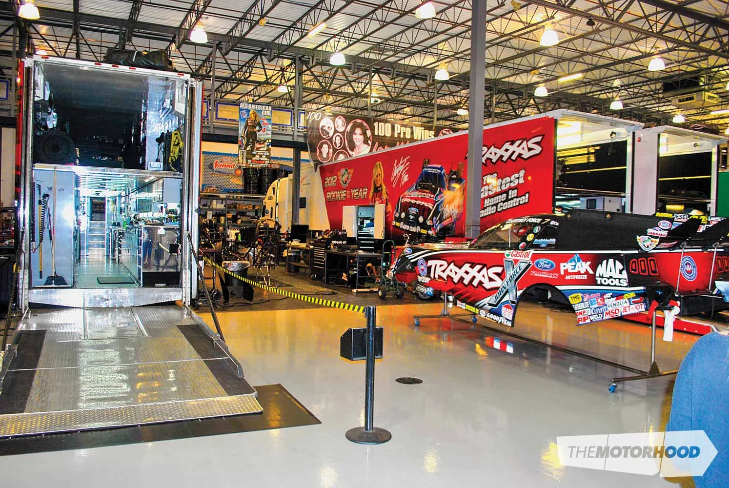 In addition to the eight rigs for the race cars, there is also the conference/PR/lounge trailer, in which the teams’ managers and PR people go about their business, as well as a lounge area for the Force family. Now don’t forget the John Force Racing Road Show trailer, which promotes JFR and its sponsors at events — all up, you have 10 truck and trailer units at each meeting. That’s a serious fuel bill just to get the teams there!