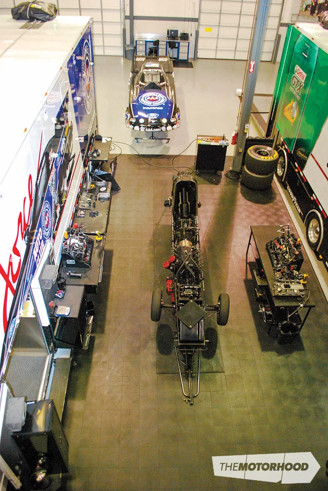 Although John himself lives in Yorba Linda, California, his race teams are a 30-hour drive away on the other side of the country in Brownsburg, Indiana. This location is central to many of the stops on the NHRA tour, and also the home of many other Top Fuel teams. John’s 150,000 square foot facility houses all four race teams, a chassis shop, a paint/decal shop, a machine shop, a supercharger development room, a parts department, and, of course, the offices required to keep things ticking over. Each team pulls both its trucks inside the facility and sets them up side by side, just as they would at the racetrack. They maintain, rebuild, and repair the cars exactly as they would at the racetrack, working directly out of the trailers.