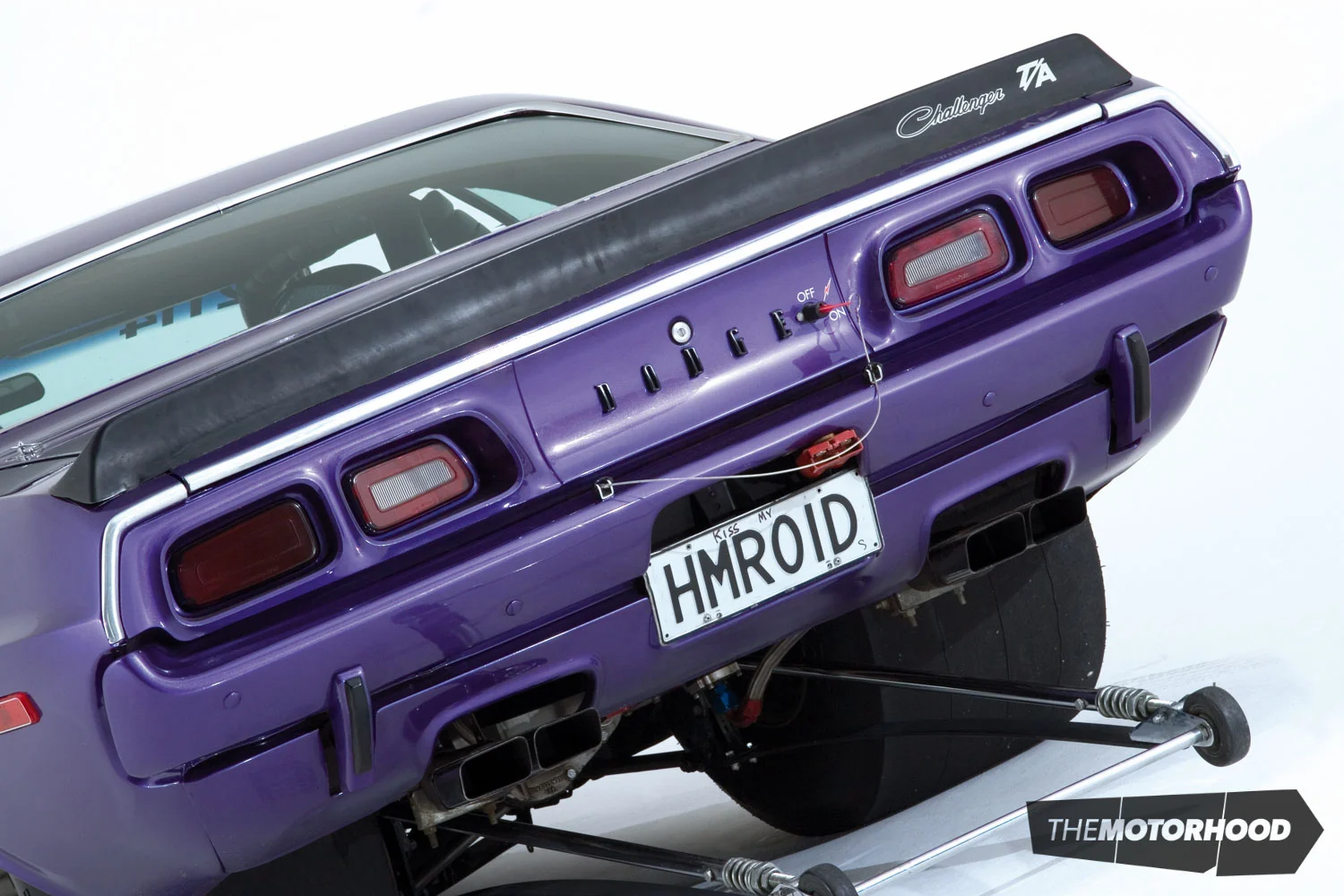 When Mike bought the car, it had already had a custom half chassis made up from two-inch box section that tied into the eight-point roll cage. When Mike axed the Harwood scoop off the lid, he also took a spoiler off the boot — he wanted HMROID to look as close to street as possible. An original T/A Challenger spoiler adorns the boot, with a T/A air dam bookending the Challenger at the front. Logan Rooke of Logan Signs made up the graphics down the sides of the beast. Take a good hard look at the curve of the guard over the rear tyres. Notice that flat spot at the top — the wheel arch had to be lengthened by four inches just to fit those massive tyres.