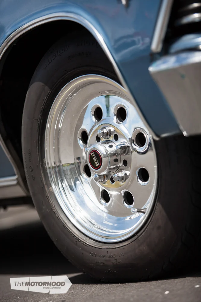 - Wheels/ tyres: 15×5-and 15×8-inch Weld racing Drag Lite, Mickey Thompson 26×6 Sportsman front tyres, Mickey Thompson 28×12.5 ET Street rear tyres