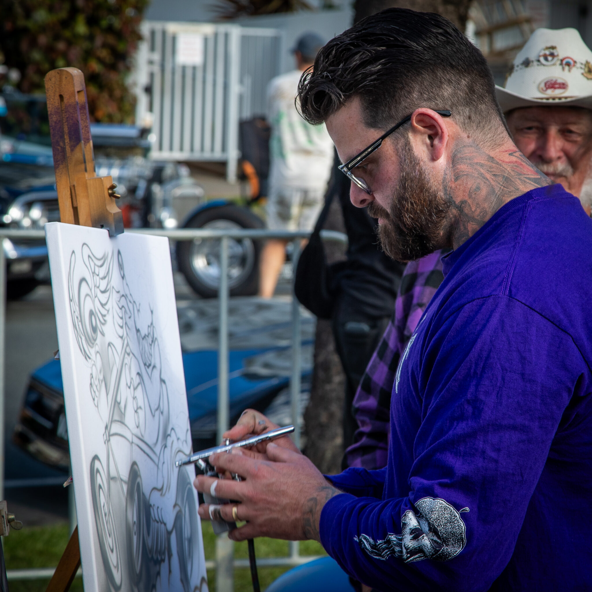 Kustomville has become the beating heart of Cooly Rocks On. It isn’t your typical ‘park it and polish it’ car show. It’s an active, living space full of noise, art, and hands-on craftsmanship. Each day brings something fresh — live airbrushing from Beatniks artists like Little Mick, Jayboy, and Kyle Smith from Smith Concepts, with Scotty Makin working the pinstripes while we’re out in the car park chopping cars and building hot rods. Mogi-san from Japan paints live, and there’s rocker-cover racing for the kids, which grows every year. Best of all, it’s completely free, and all about sharing the passion behind the culture.